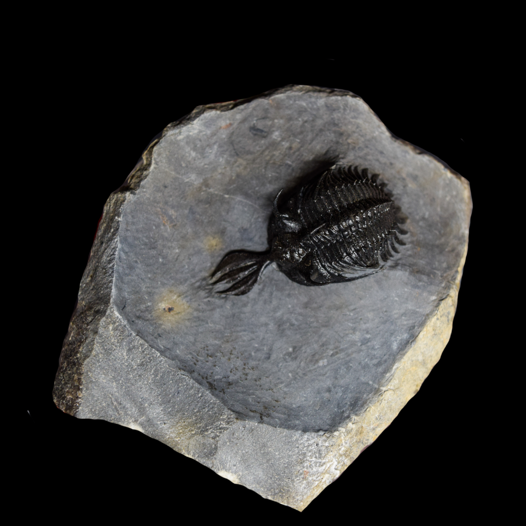 Descripción: El rasgo más asombroso de este género es la larga protuberancia frontal que termina en tres puntas. No se sabe con certeza su función, pero las teorías incluyen defensa, un órgano sensorial o, más probablemente, para el combate sexual entre machos. Al extraer estos fósiles de las rocas, los mineros en Marruecos tardan hasta 24 horas en poder liberar este tridente de toda la matriz rocosa en la que se encuentra.